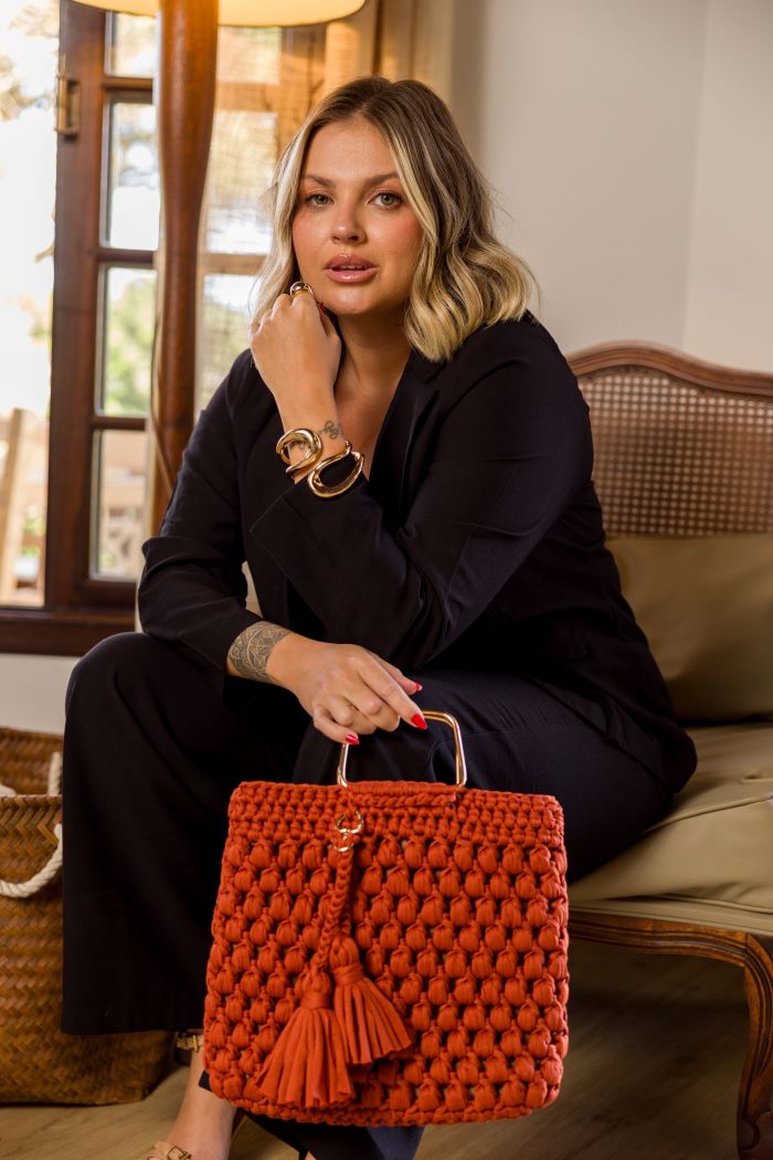 A Alça de Metal é supermoderna, mas também discreta. Com ela, o trabalho manual utilizado na confecção da bolsa será, com certeza, o grande destaque da peça!